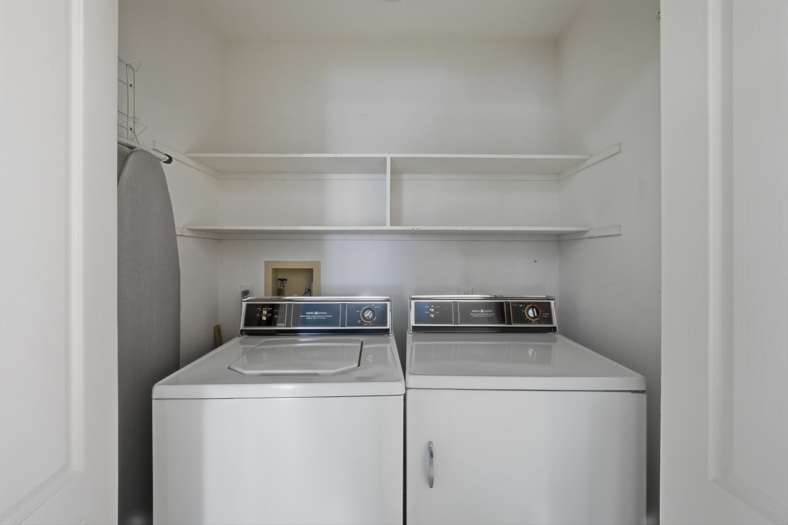 The primary bedroom suite offers abundant closet space and an en-suite bathroom with dual sinks, a soaking tub, and a separate shower. The two additional bedrooms are generously sized and share a bathroom. Tile flooring throughout ensures easy care. A dedicated laundry area includes a washer, dryer, and extra shelving. For your convenience, there’s a rare three car garage, providing ample storage.